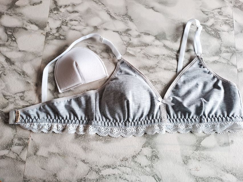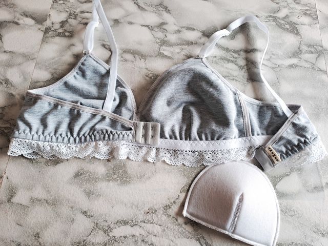 Corpiño triángulo de algodón y detalle de puntilla en cintura.Tiene bolsillo interno para colocar tazas flotantes desmontables realizadas en bondeado. Breteles fijos regulables con avíos de plástico (aro y corredera)