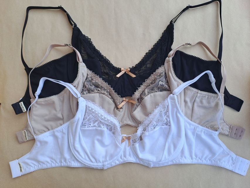 Reyna es un corpiño de algodón y detalle de puntilla en copa, con arco entero, breteles fijos con avíos (aro y corredera) plásticos de 10mm para talles menores a 40A (equivalente a talle 100) y metálicos de 18mm para talles superiores a 40A