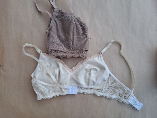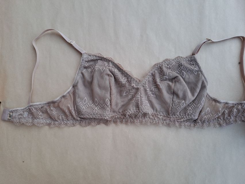 Corpiño sin arco, con base, de puntilla y copas forradas de algodón con abertura para poner tazas desmontables (disponibles), breteles fijos de 1cm con avíos (aro y corredera) de plástico (excepto talle 105 que tiene bretel de 1,8cm y avíos metálicos)