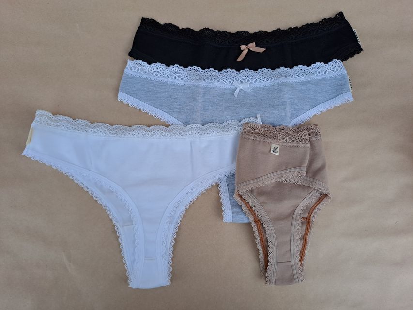 Pack de 3 bombachas colaless de algodón con elástico fantasía en piernas y cintura con puntilla. Tiro medio