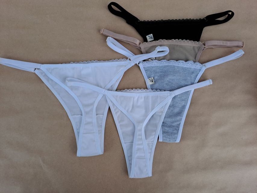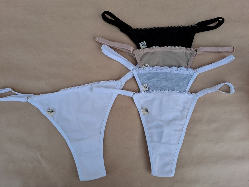 Tanga colaless regulable de algodón, tiro de 22 cm, bretel de 1 cm de ancho y avíos de plástico (aro y corredera)